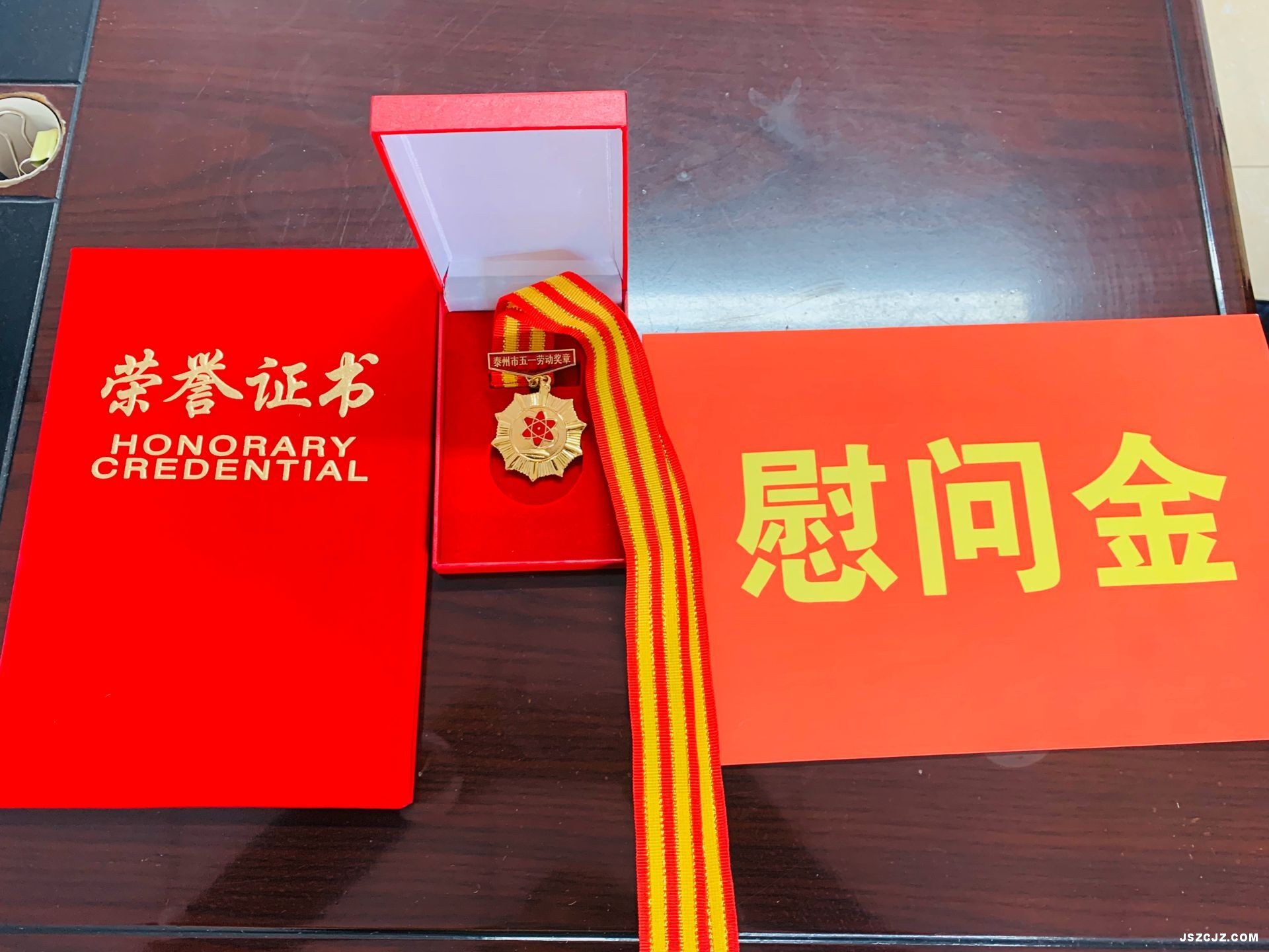 李书记在现场亲手将鲜红的荣誉证书、闪闪发亮的泰州市“五一”劳动奖章、慰问金以及鲜艳的花束送到吴董手上,并发表热情讲话,他说:五一节即将到来,我们特来向你表示慰问,我们都是劳动者,我们都要向你学习,同时,也借此机会向所有辛勤工作在各自岗位上的劳动者们表示节日的慰问。