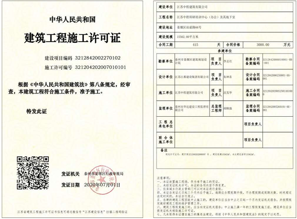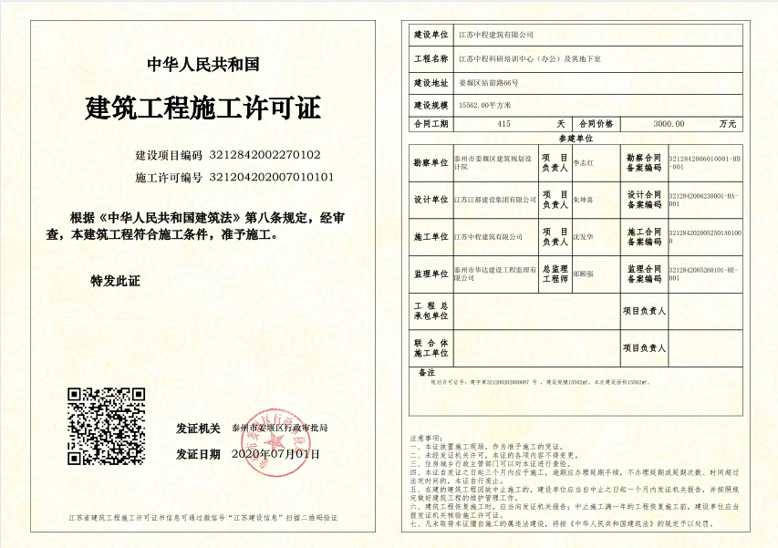 公司科研培训中心(办公)项目,一直以来备受社会各界和公司上下关注。在举国同庆建党99周年之际,该项目传来好消息,7月1日,泰州市姜堰区行政审批局向项目建设单位——江苏中程发放施工许可证。这在公司办公大楼建设上具有里程碑意义,同时意味着我司办公大楼建设正式拉开帷幕。