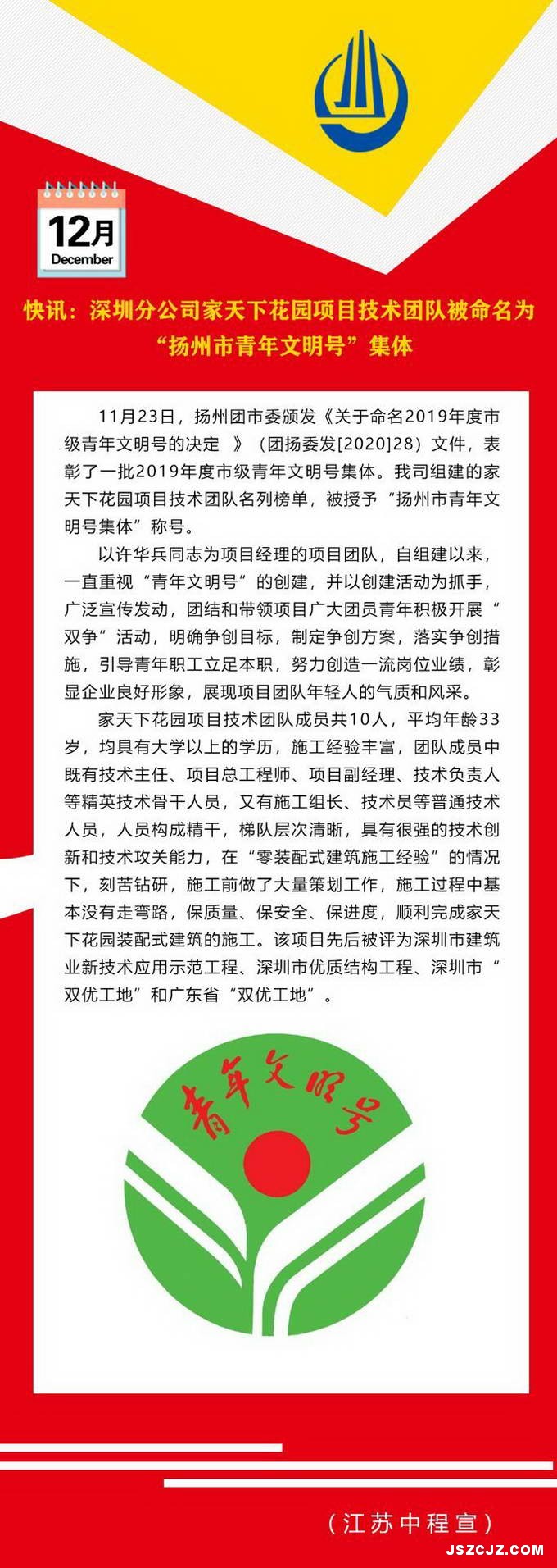 快讯:深圳分公司家天下花园项目技术团队被命名为“扬州市青年文明号”集体