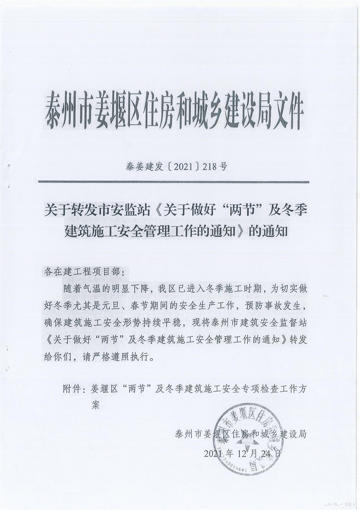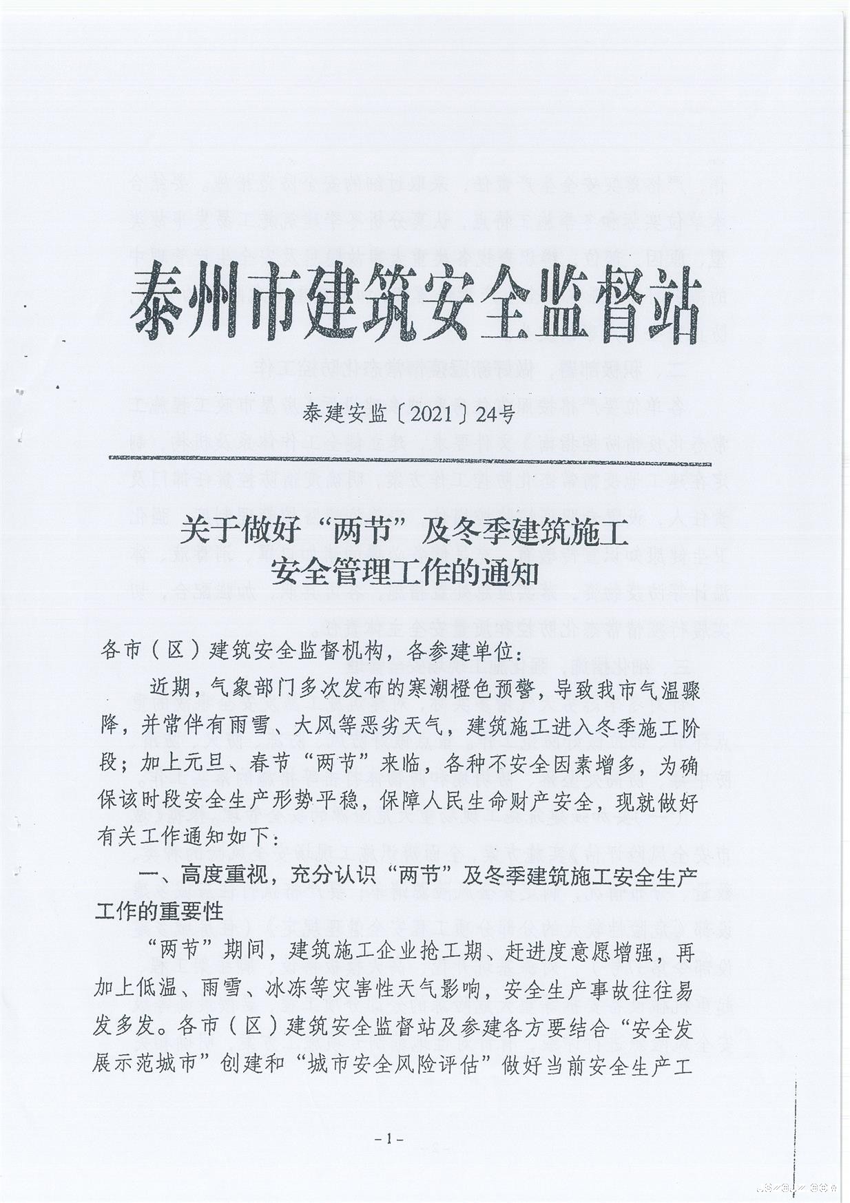 关于转发市监站《关于最好“两节”及冬季建筑施工安全管理工作的通知》的通知