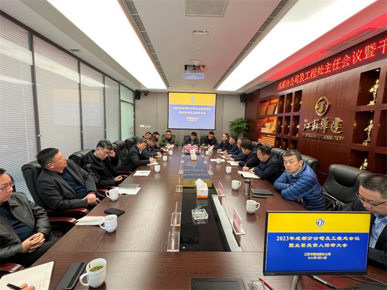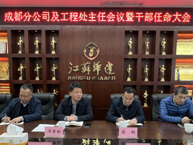 224日下午,华建公司组织召开成都分公司全体人员及工程处主任会议,扬州建工控股集团、江苏华建总经理吴碧桥宣读了分公司主要负责人的任职决定,宣布蒋超同志为成都分公司总经理兼重庆分公司总经理。会上,新接任的成都分公司总经理蒋超表态发言,感谢组织的信任和培养,并提出分公司进一步发展的思路。我司董事长吴桂松表示将自始至终、一以贯之关心、支持成都分公司的发展,保持与华建同心同向同行,形成更加紧密的事业共同体、利益共同体和命运共同体。