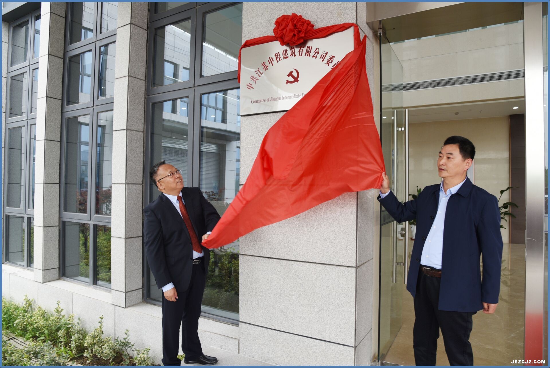 随后,在出席落成庆典仪式的领导、嘉宾和机关全体干部职工的共同见证下,公司领导吴桂松、钱承荣为“江苏中程建筑有限公司”揭牌,吴桂松、于筛云同志为“中共江苏中程建筑有限公司委员会”揭牌,揭牌后鞭炮声四起,再次将庆典活动推向高潮,大家共同分享着新办公大楼落成的生日蛋糕。
