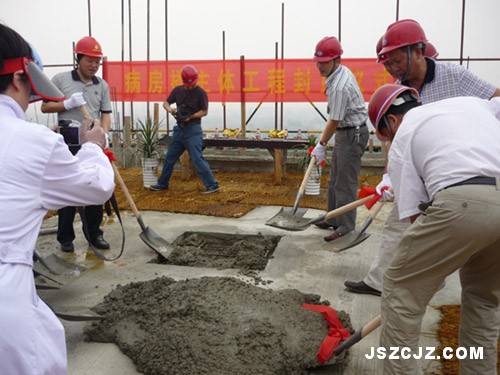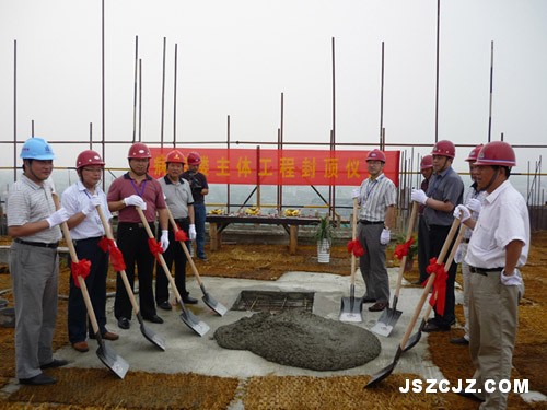 今天,工地现场红旗招展、鞭炮齐鸣,在一片热烈、祥和的气氛中,市中医院、市振兴监理公司等有关单位领导和公司领导杭中和、徐敏一起为最后的封顶浇灌混凝土。实现了主体结构按时、顺利封顶。