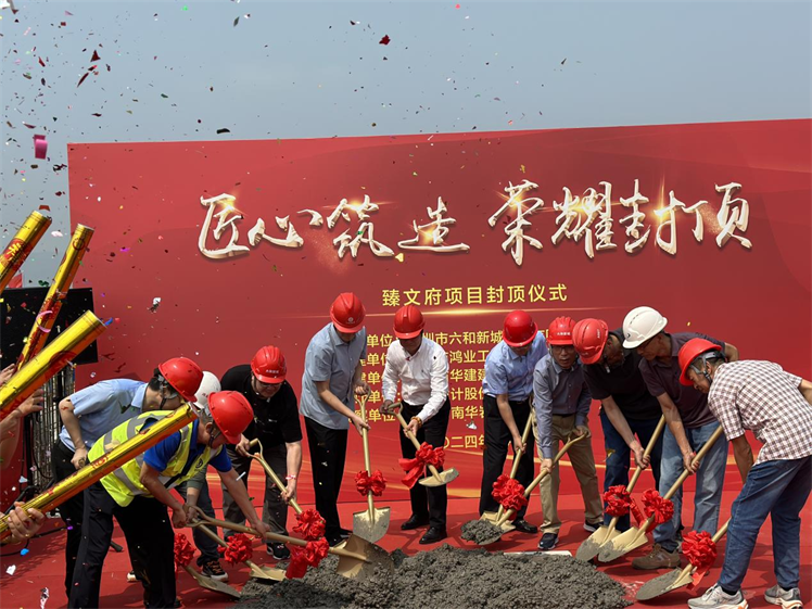 在封顶仪式上,深圳市六和新城投资有限公司董事长张广全、深圳分公司常务副总经理施卫东以及我公司董事长钱承荣等领导亲临臻文府项目主体结构封顶现场,共同见证这一重要时刻。同时,他们对我公司在施工过程中取得的阶段性成果表示热烈祝贺,并通过深入现场,查看施工情况,对后续工作进行部署和规划,共同期待项目能顺利迈向竣工目标。