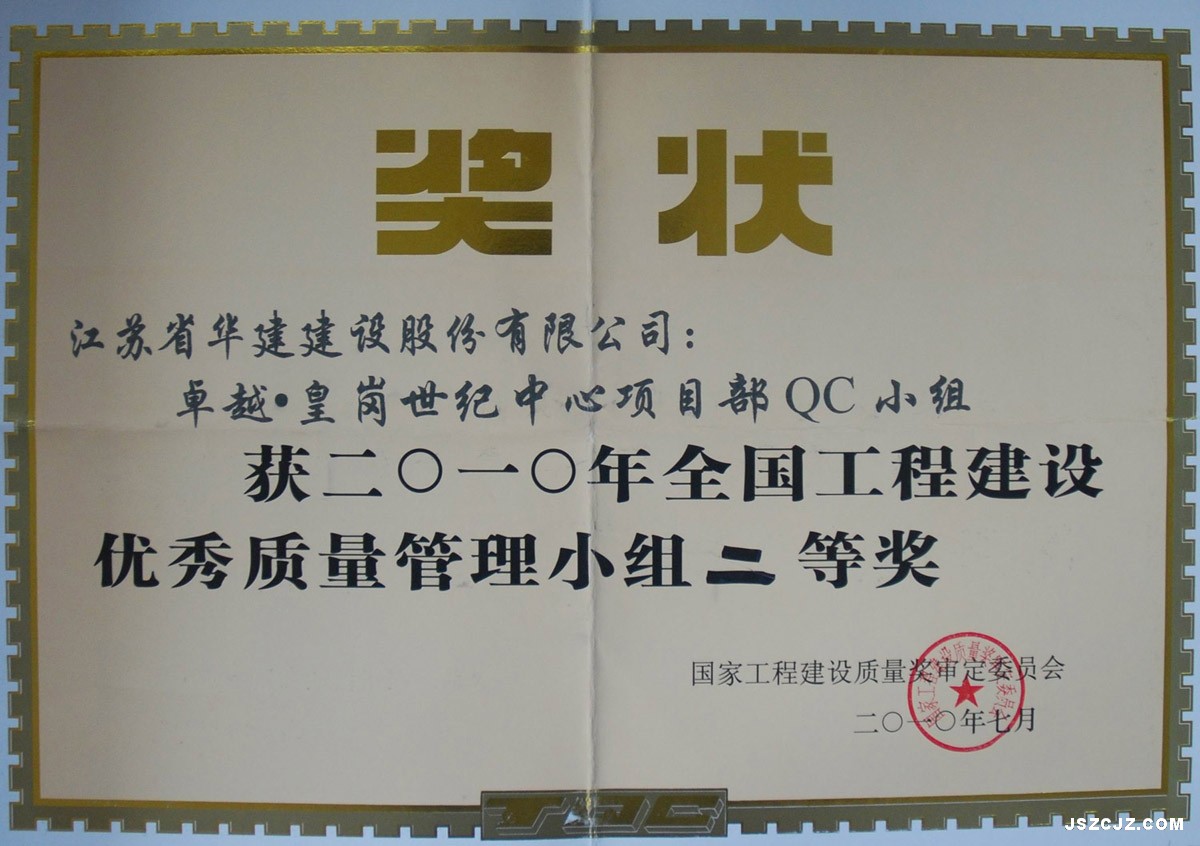 深圳卓越·皇岗世纪中心吴桂松项目部QC小组被国家工程建设质量奖审定委员会评为二O一O年全国工程建设优秀质量管理小组二等奖。
