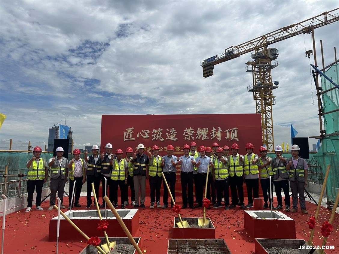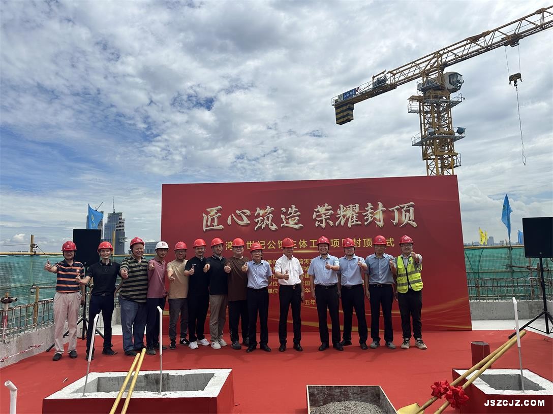 8月22日上午,由深圳分公司总承包承建的湾涛世纪公馆项目迎来了项目建设历程中的里程碑时刻,上午10时58分,伴随着最后一方混凝土的浇筑完成,项目主体结构正式荣耀封顶。湾涛实业有限公司董事长张广全、华建公司总经理吴碧桥、公司董事长钱承荣及设计团队、合作伙伴等齐聚一堂,共同见证了这一激动人心的时刻。
