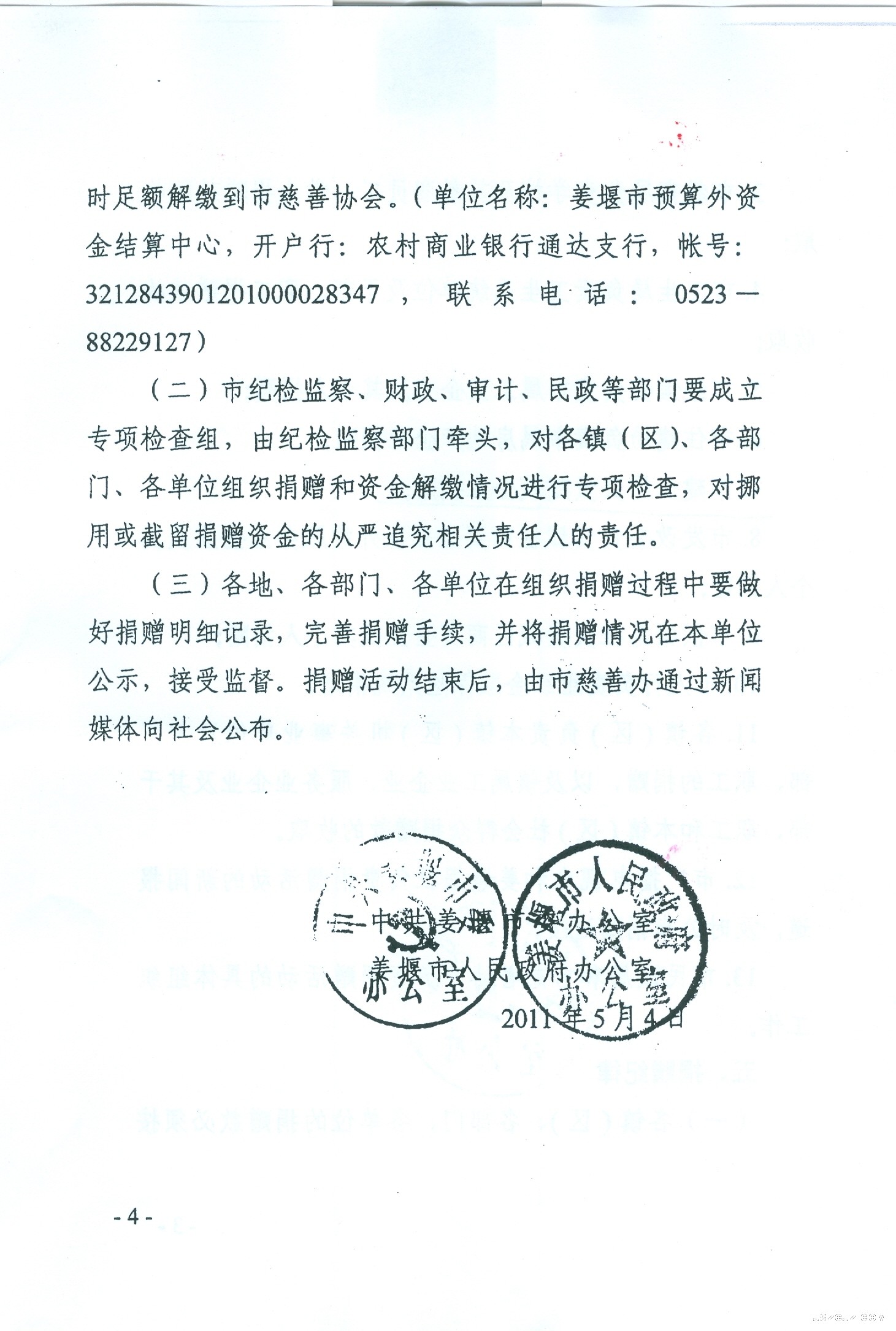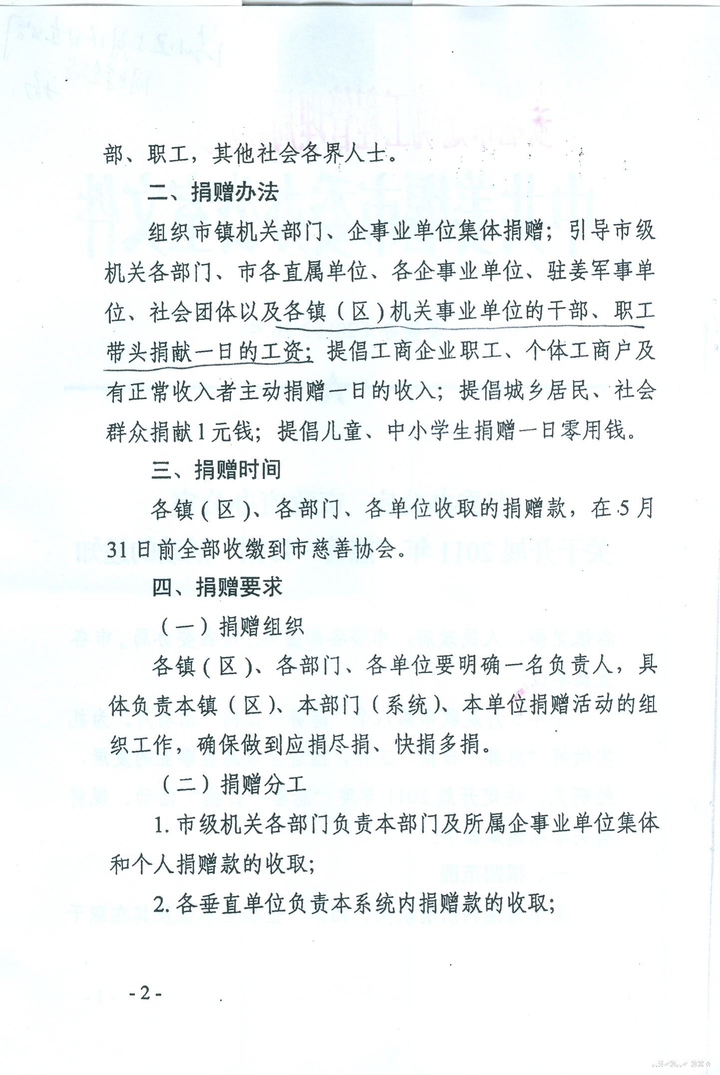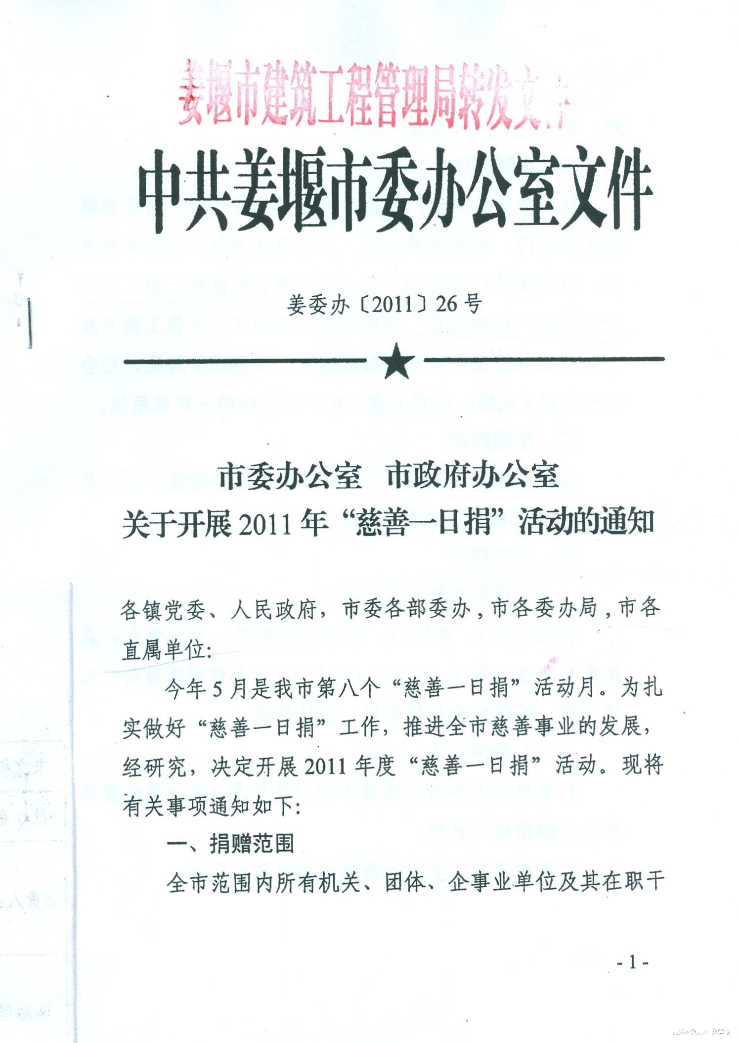 现将姜委办[2011]26号“关于开展2011年‘慈善一日捐’活动的通知”转发给你们,请你们认真学习宣传通知精神,组织本单位、本部门人员捐款,并将所捐款额于2011528日前汇转至公司财务部,以便统一解缴至市慈善协会。
