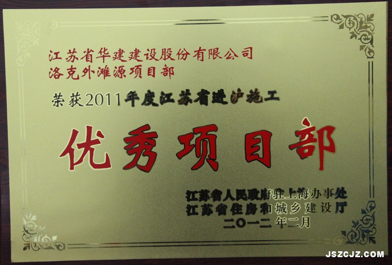 2012年2月底,我公司上海洛克外滩源项目部,被江苏省人民政府驻上海办事处、江苏省住房和城乡建设厅表彰为2011年度江苏省进沪施工优秀项目部。