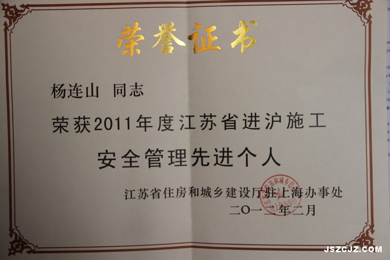 杨连山同志被江苏省住房和城乡建设厅驻上海办事处表彰为2011年度江苏省进沪施工安全管理先进个人。