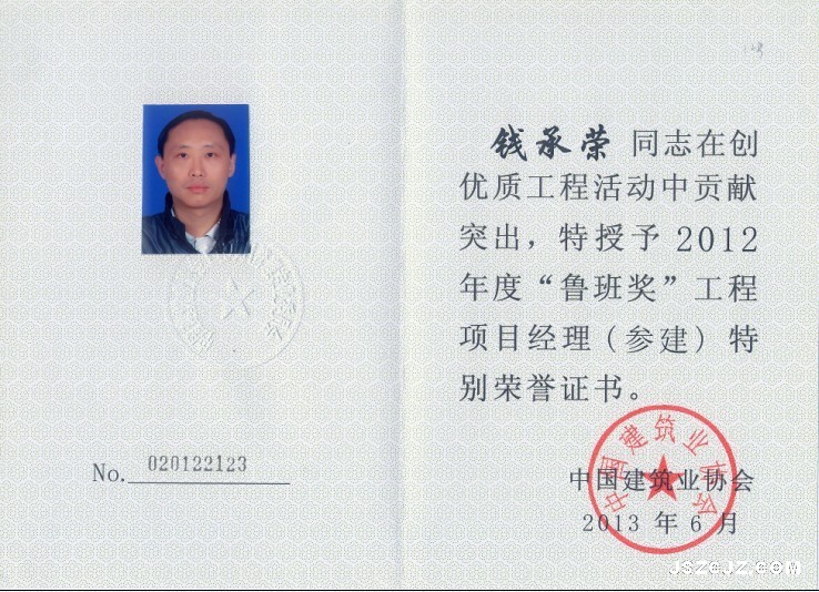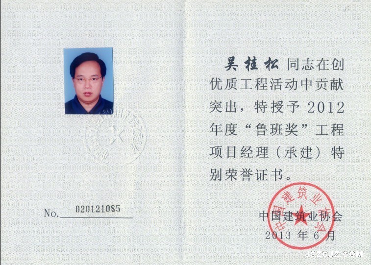 日前,公司副董事长、总经理吴桂松,副总经济师、深圳分公司副经理钱承荣,在创优质工程活动中贡献突出,分别被中国建筑业协会授予2012年度“鲁班奖”项目经理(承建)特别荣誉和2012年度“鲁班奖”项目经理(参建)特别荣誉,发给荣誉证书。