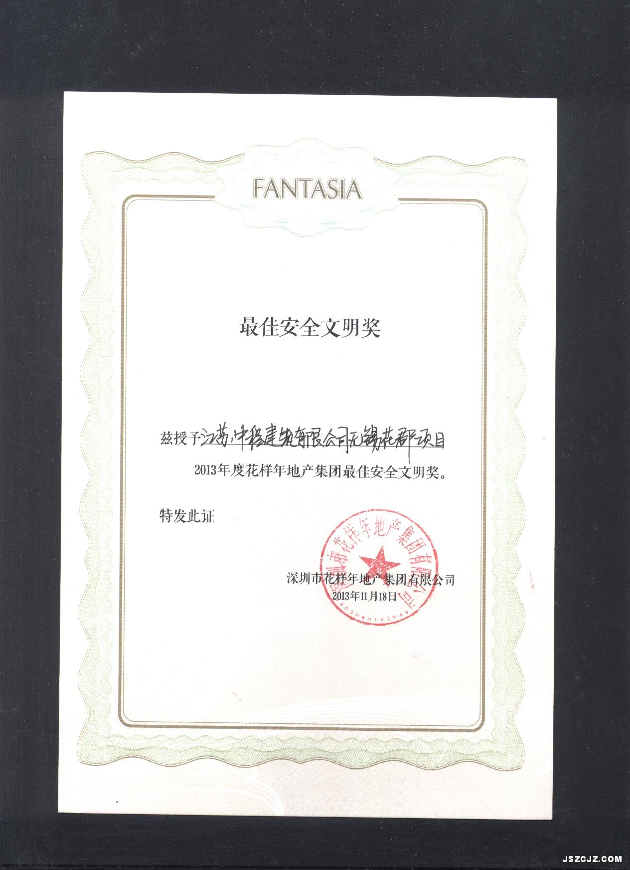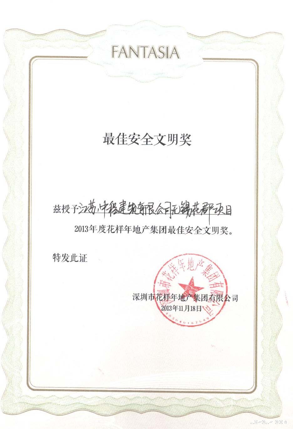 2013年11月,我公司无锡分公司花郡家园项目部,喜获2013年花样年房地产集团公司最佳安全文明奖,这是我公司与该集团公司合作十四年来首次获得的殊荣。