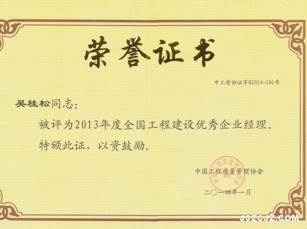 公司副董事长、总经理吴桂松同志被中国工程质量管理协会评为2013年度全国工程建设优秀企业经理。