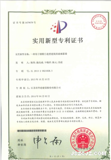 近日,深圳分公司传来好消息,由陈伟、卞晓祥、陈元、苏晨四同志发明的《一种用于圆锥台造型建筑的玻璃幕墙》技术,经过前期的精心准备和申报,于近期获得国家知识产权局颁发的“实用新型专利”证书。这是我公司获得的首个创新技术专利,是我公司科技创新的一次全新突破。