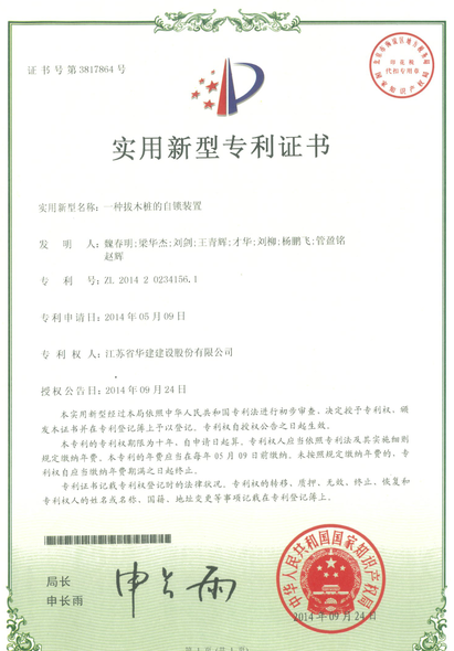 近日,我公司上海分公司梁华杰、刘剑、王青辉等人申请的《一种拔木桩的自锁装置》,获得国家知识产权局认证的实用新型专利。