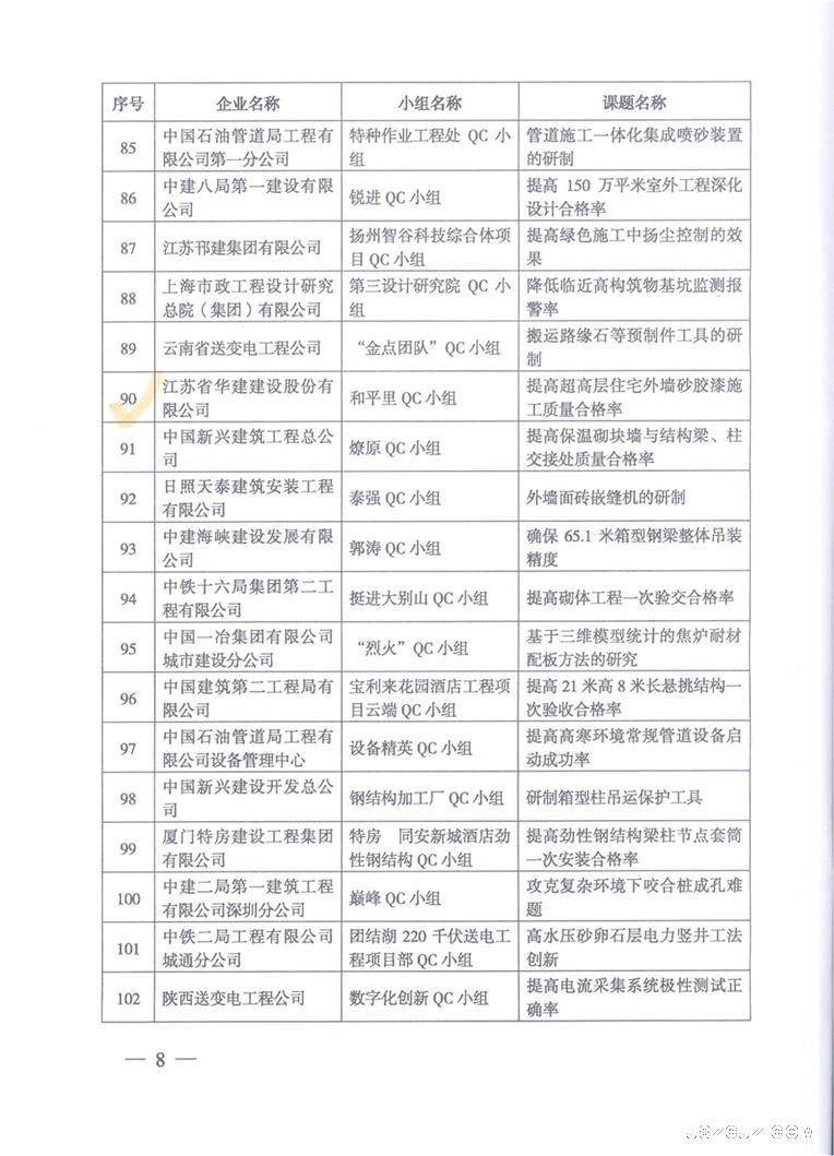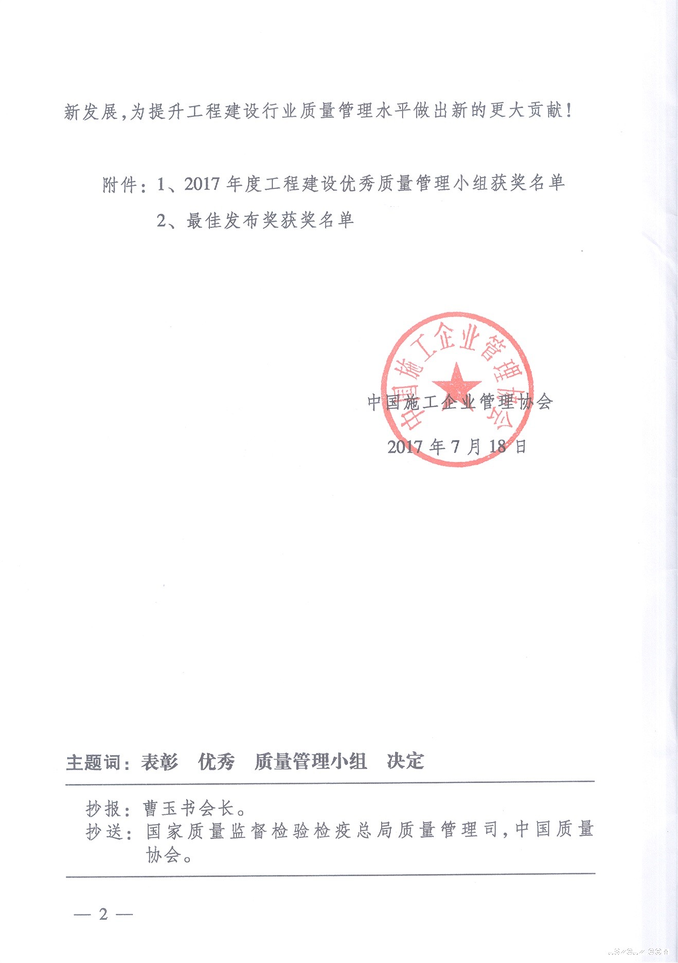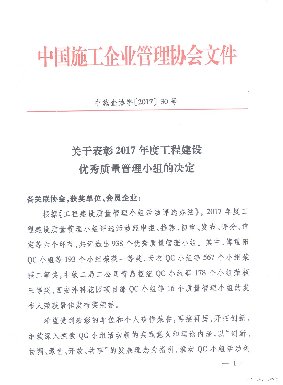 关于表彰2017年度工程建设优秀质量管理小组的决定