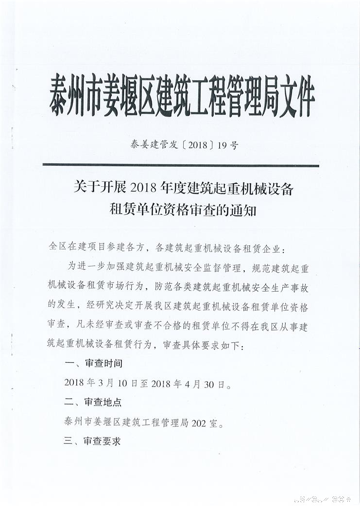 关于开展2018年度建筑起重机械设备租赁单位资格审查的通知